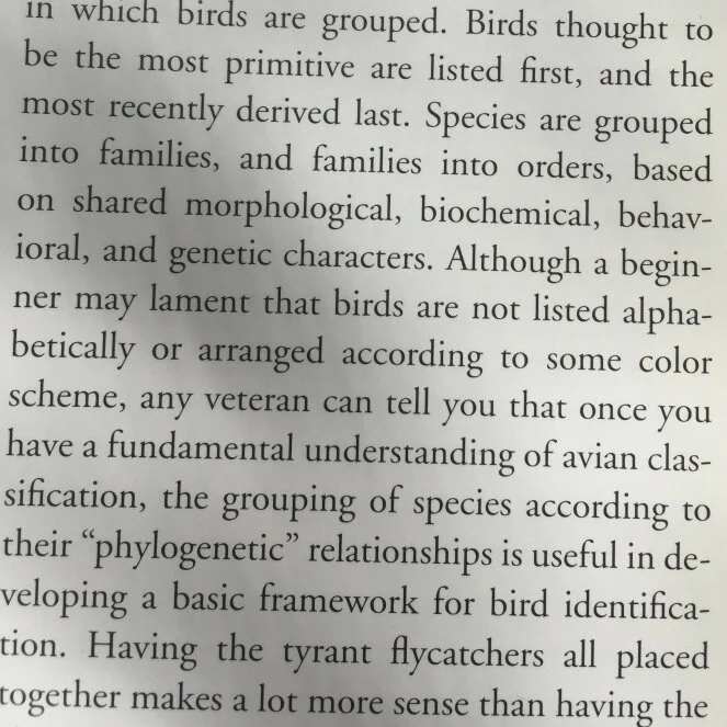 “…any veteran can tell you that once you have a fundamental understanding of avian classification, the grouping of species according to their “phylogenetic” relationships is useful in developing a basic framework for bird identification.” Why have you picked up this book, newbie? You need to understand avian classification first. Go inside and study and forget the joy of identifying your first few birds until then. …sorry, I’ll make the next picture a pretty one.