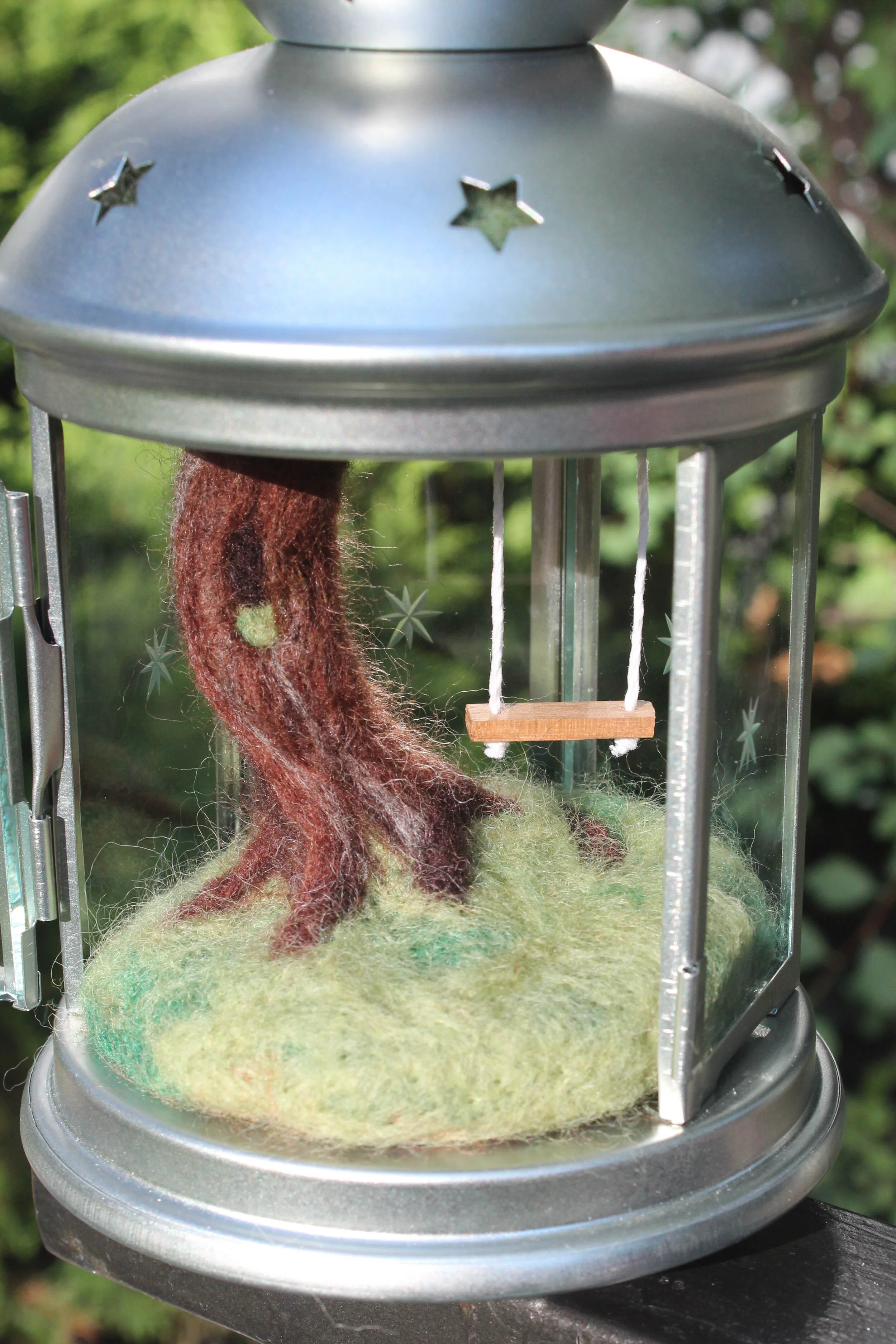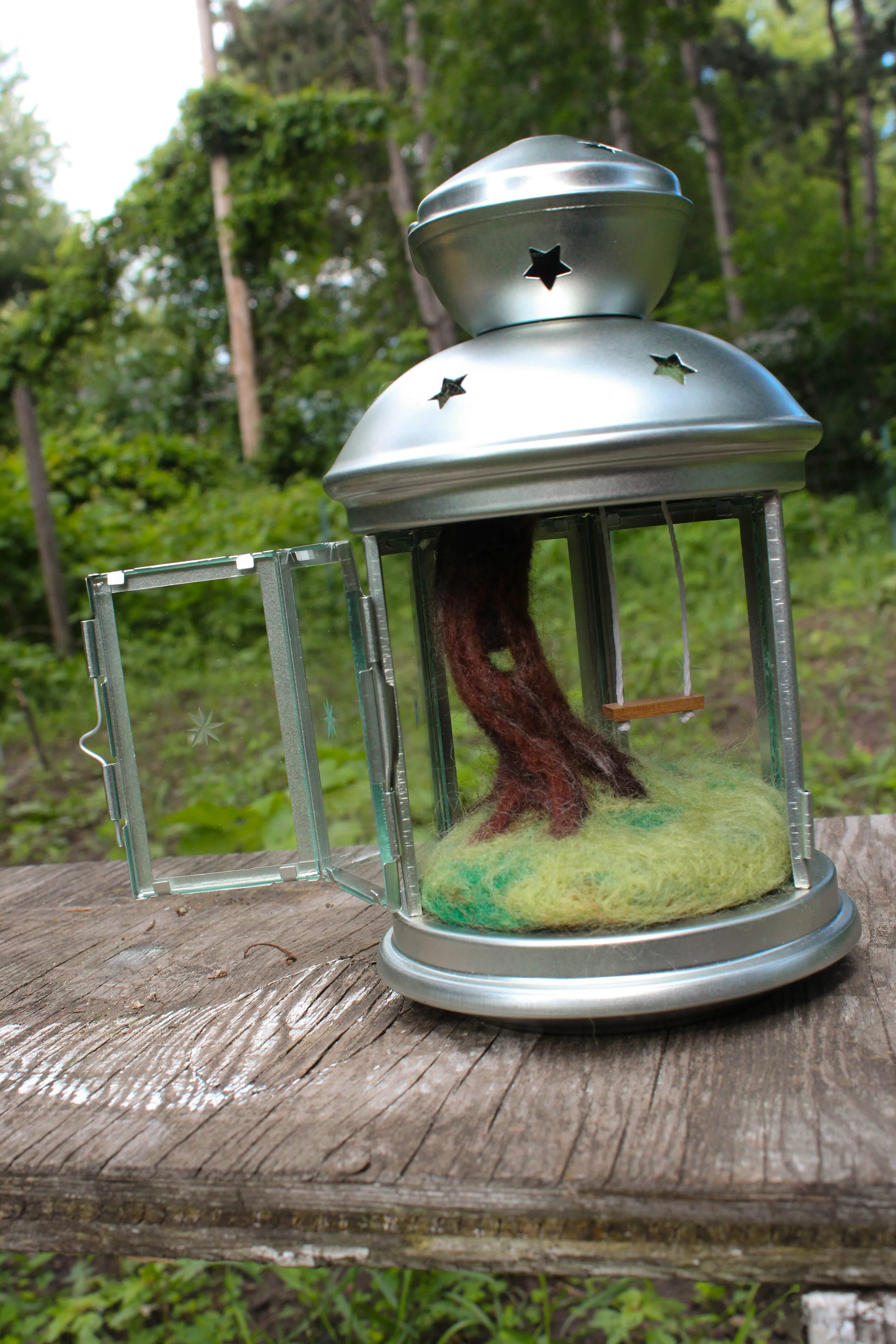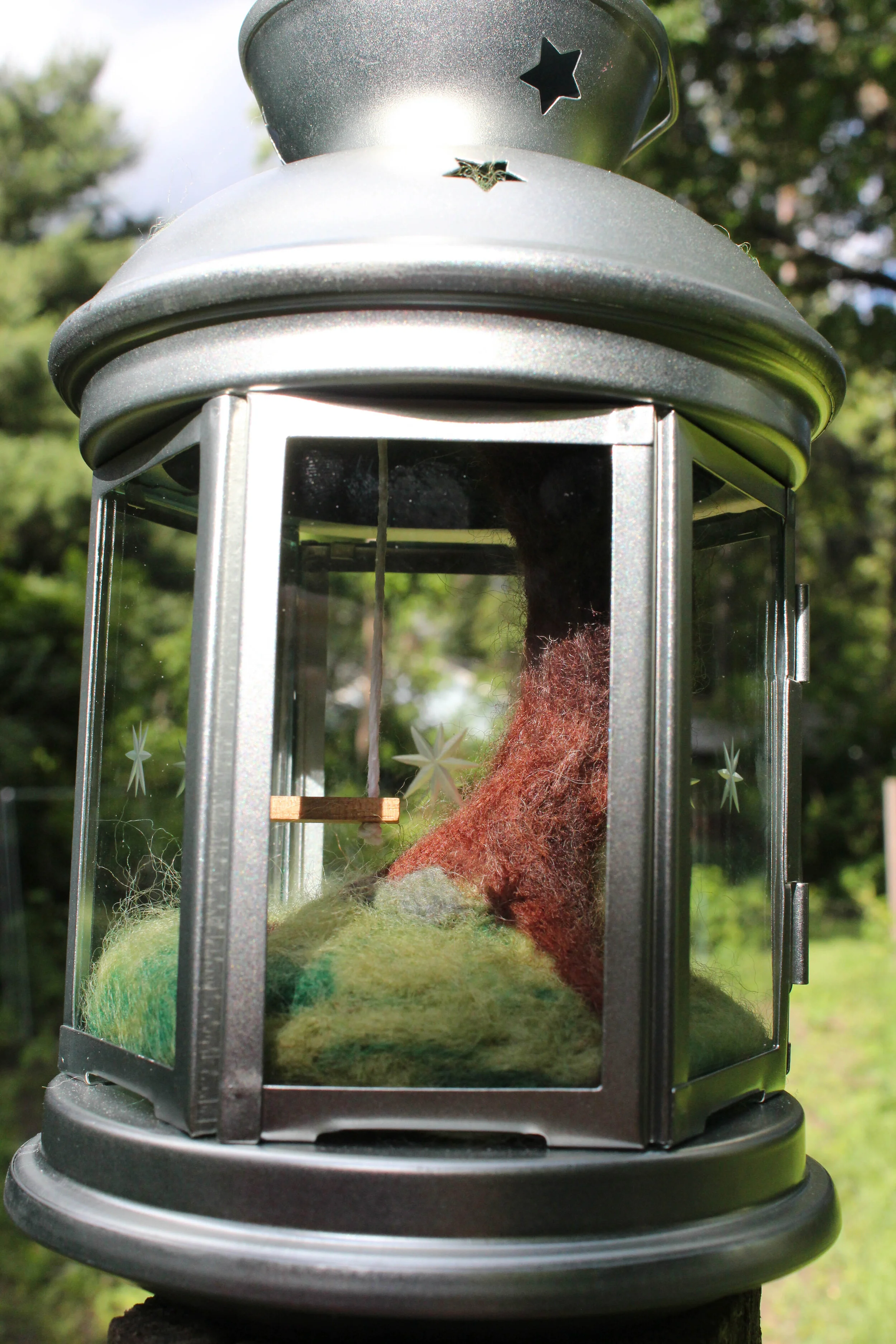 Sometimes, a thing just demands to be made.I've made tiny scenes under glass bells before, and I've known about these lanterns (from Ikea) for years, but last night I sat down with a lantern and my felting tools and went to town. I'm utterly delighted by the result: a felted scene that demands to be picked up, turned, and examined, with little details to notice.